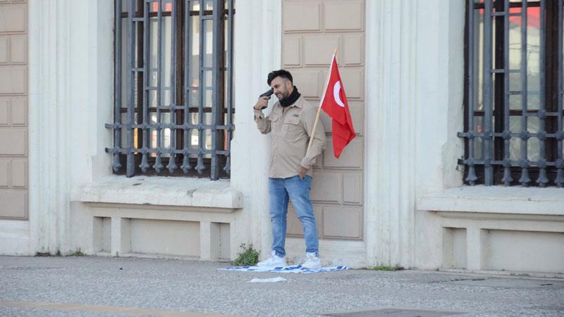 Olay dün saat 13.00 sıralarında Cumhuriyet Bulvarı'nda meydana geldi. Kiraladığı otomobille caddeye gelen Muhammed N. (23) araçtan inip, elindeki İsrail bayrağını yere serip üzerine bastı. Daha sonra eline Türk bayrağı alan Muhammed N, başına tabanca dayayıp eylem gerçekleştirdi.