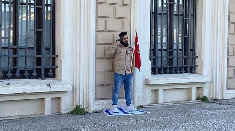 İzmir'de elinde Türk bayrağı olan, yere serdiği İsrail bayrağının üzerine basıp, başına tabanca dayayan kişi, polis ekiplerince 2 saatte ikna edildi. Tabancayı bırakıp, gözyaşları içinde teslim olan protestocunun Pakistan uyruklu ve ön isminin Muhammet (23) olduğu öğrenildi.