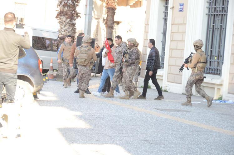 İzmir'de elinde Türk bayrağı olan kişi, yere serdiği İsrail bayrağının üzerine basıp, başına tabanca dayadı. Polis, kişiyi ikna etmeye çalışıyor.