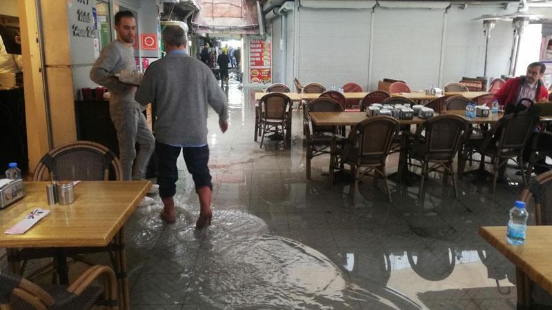İzmir'de etkili olan sağanakla birlikte tarihi Kemeraltı Çarşısı’nda su baskınları yaşandı. Esnaftan bazıları, ellerinde fırçalarla suların dükkanlarına girmesini engellemeye çalıştı.