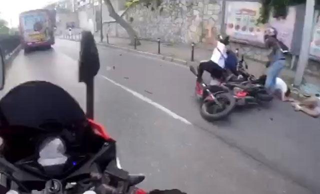 Olay, Beyoğlu Meclis-i Mebusan Caddesi'nde dün saat 19.00 sıralarında meydana geldi. Karaköy istikametine seyir halinde olan motosikletli, duraktan yolcu alan otobüs sol şeride girip kendisini sıkıştırınca sağ şeride geçmek istedi. Sağ şeride geçen motosikleti arkadan gelen başka motosiklet fark etmeyerek arkadan çarptı. İki motosiklet yola savrulurken üzerinde bulunan 4 kişi de yere düştü. Kazada 4 kişi hafif şekilde yaralanırken, kaza anı bir başka motosiklet sürücüsünün kask kamerası tarafından saniye saniye kaydedildi.