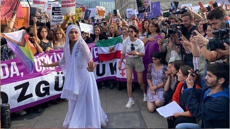 İranlı bir kadının dans gösterisinin ardından açıklama yapan kadınlar, "Kadın olduğumuz için şiddet görüyor, katlediliyoruz. Biliyoruz örgütlenen bu şiddete karşı tek çözüm, sınır tanımayan kadın dayanışmasında, kurtuluş ortak mücadelemizde" dediler. İranlı kadınların da konuşmalarının ardından sloganlar atan gruptan bir kadın saçını kesti. Kalabalığa çok sayıda erkeğin de destek verdiği görüldü.