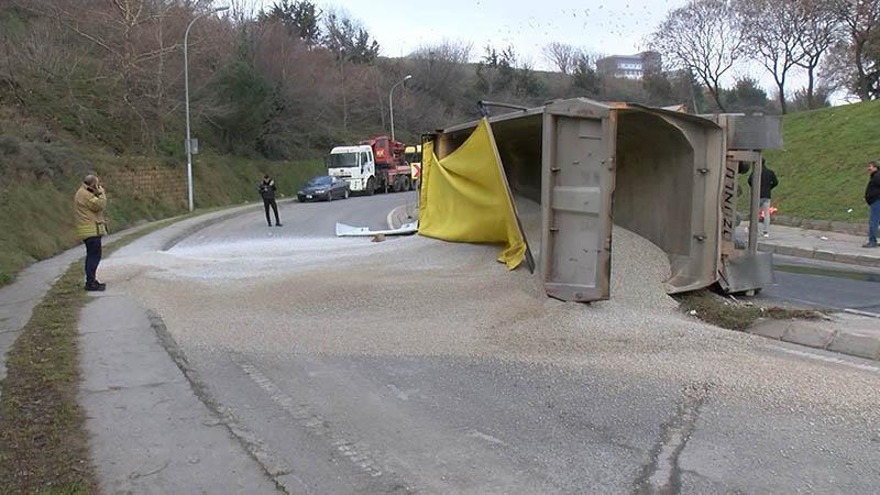 Kadıköy’de şoförünün direksiyon hakimiyetini kaybettiği mıcır yüklü hafriyat kamyonu, virajı alamayarak devrildi. Kamyon şoförünün hafif yaralandığı kazada dökülen mıcır nedeniyle yol bir süre trafiğe kapandı.
