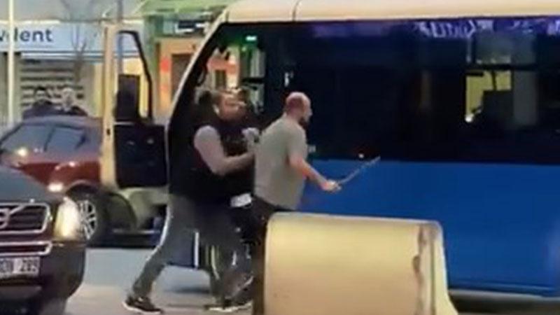 Elinde sopayla hafif ticari aracından inen sürücü, minibüs şoförüne saldırdı. Kavga çevredeki kişilerin araya girmesiyle son buldu.