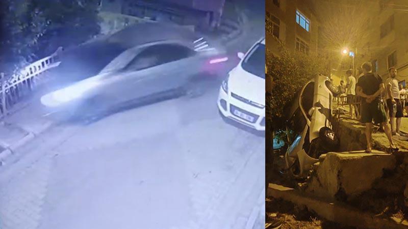 Kağıthane’de yokuş aşağıya seyrettiği sırada sürücüsünün direksiyon hakimiyetini kaybettiği otomobil, korkulukları kırarak 5 metrelik bina boşluğuna düştü. Kazanın ardından sürücü araçtan çıkarak olay yerinden kaçtı. Kaza anı güvenlik kamerasına yansıdı.