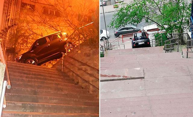 Kağıthane'de sürücüsünün yolun devamı sanıp merdivenlere sürdüğü otomobil mahsur kaldı.