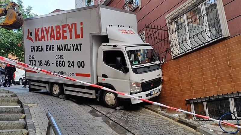 Kağıthane'de manevra yapan nakliye kamyoneti kontrolden çıkarak 4 katlı binanın duvarına çarptı. Binada hasar oluşurken, kaza anı güvenlik kamerasına yansıdı.