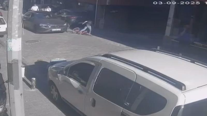 Kağıthane'de iddiaya göre kendisini kovalayan kişiden bisikletle kaçan A.U.İ.’ye (10) otomobil çarptı. Kaza sırasında çocuk yere savrularak hafif yaralandı. Çocuğu takip edip kovalayan kişi ise, yere düştükten sonra çocuğu tekme ve yumruk atarak darbetti.Olay anı güvenlik kamerasına yansıdı.