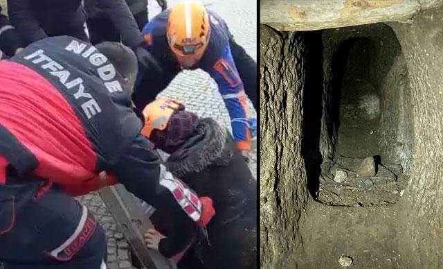 Niğde Kalesi’nde geziye çıkan Rukiye Ulusoy (47), bastığı zeminin çökmesi sonucu kaçak kazı yapan definecilerin açtığı 200 metre uzunluğundaki tünele düştü. Bu sırada tünelde bulunan 2 kişi kaçarken, Ulusoy düştüğü yerden ekipler tarafından kurtarıldı.