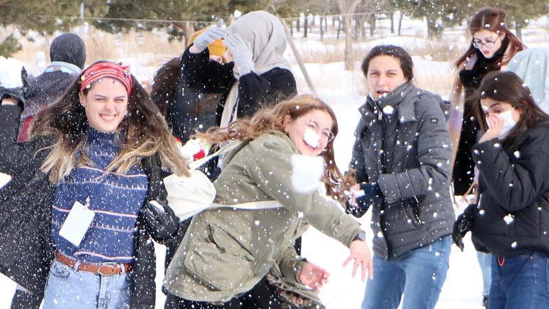 Gençlik ve Spor Bakanlığı Kredi ve Yurtlar Genel Müdürlüğü organizatörlüğünde Erzurum'da bu yıl 6’ncısı düzenlenen tematik kış kampına katılan 150 üniversite öğrencisi, soğuk havada kampüste kar topu savaşı yaptı.