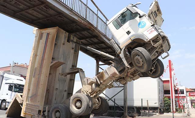 Kaza, öğle saatlerinde Yalova-İzmit karayolunda meydana geldi. Çiftlikköy ilçesinde Erol Aslıhak (64) yönetimindeki 06 KYL 29 plakalı kamyon, damperi açılınca üst geçide çarptı. Damper üst geçide sıkışırken, kamyon adeta şaha kalktı.