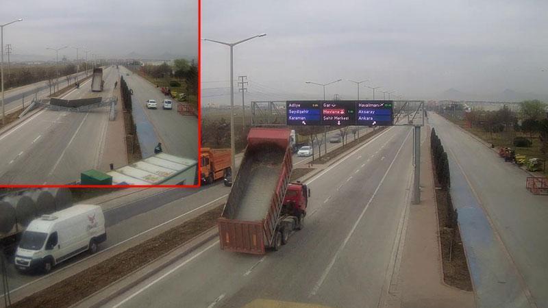 Konya'da sürücü R.Y.'nin kamyondaki hafriyatı boşalttıktan sonra açık unuttuğu damperin çarptığı dijital yön levhası devrildi. O anlar kameralara yansıdı.