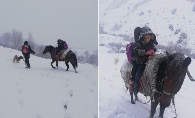 Bingöl’ün Genç ilçesine bağlı Haraba köyünün yolu kar nedeniyle ulaşıma kapanınca Abdulhakim Ak (41), taşımalı sistemle eğitim gören kızı Rubelin (8) ile komşusunun oğlu Numan Botan’ı (7) at sırtında okula götürdü.