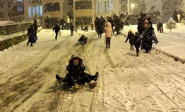 Karabük'te akşam saatlerinde etkili olan kar, sürücülere zor anlar yaşattı. Sürücüler karla kaplı yokuşları çıkamazken, çocuklar ve gençler ise yokuş aşağı kayarak eğlendi.