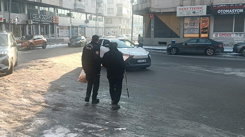 Kar nedeniyle kaygan hale gelen zeminde yürümekte zorlanan görme engelli kişiyi fark eden İl Emniyet Müdürlüğü Çevik Kuvvet Şube Müdürlüğü’nde görevli polis memuru, düşmemesi için koluna girip birlikte yürüdü.