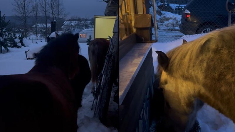 Kent merkezine yaklaşık 15 kilometre uzaklıkta bulunan kar kalınlığının yarım metreyi aştığı At Yaylası'nda yiyecek bulmakta zorlanan yılkı atları yerleşim yerlerine indi. Gökhan Bilen, akşam saatlerinde yayla evinin bahçesine kadar gelen atlara yem verdi.