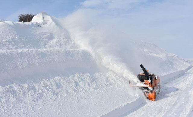 Kars - Iğdır arasında bulunan 2 bin 286 rakımlı Hanlar Geçidi başta olmak üzere Kars - Erzurum ve Kars - Ardahan kara yolunda kar kalınlığının yer yer 3 metreyi bulduğu bölgelerde kar püskürtme aracıyla yollar açılıyor.
