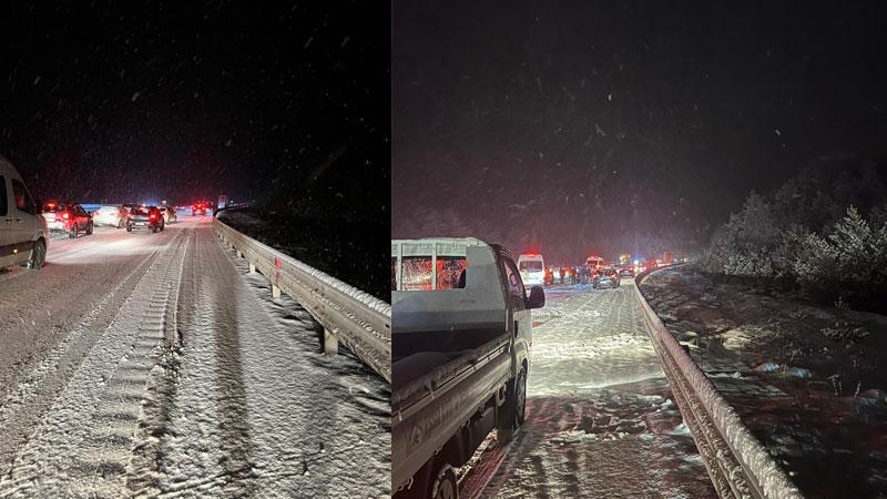 Kastamonu'da yoğun kar yağışı ve buzlanma nedeniyle TIR ve kamyonlar yolda kaldı, uzun araç kuyruğu oluştu.