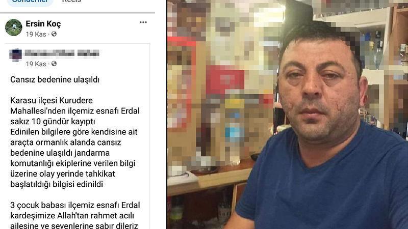 Sakarya'nın Karasu ilçesinde kaybolduktan 10 gün sonra ormanda, otomobilinde silahla vurulmuş cesedi bulunan Erdal Sakız (43) cinayetiyle ilgili tutuklanan katil zanlısı Ersin Koç'un; ceset bulunduktan sonra haberi sosyal medya hesabından paylaştığı ortaya çıktı.
