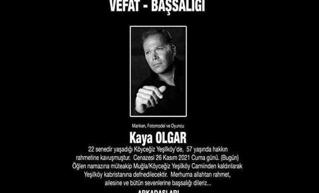 1990'lı ve 2000'li yılların aranılan manken ve oyuncusu Kaya Olgar (57) hayatını kaybetti. Acı haberi organizatör Tuncay Erkul sosyal medya hesabından duyurdu.