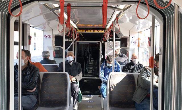 Kayseri'de, koronavirüs tedbirleri kapsamında, tramvay yolcularına anonsla cep telefonundan görüşme yapmamaları ve birbirleriyle konuşmamaları uyarısında bulunuluyor.