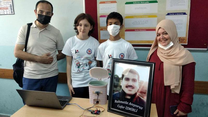 Tekirdağ'ın Çerkezköy ilçesi Şehit Erdem Uçar İmam Hatip Ortaokulu öğretmen ve öğrencileri, trafik kazasında hayatını kaybeden bilişim ve teknoloji öğretmeni Cafer İzmirli'nin (30) uzaktan sensörle açılıp kapanan ve teması aza indiren çöp kovası projesini tamamlayarak, TÜBİTAK Bilim Fuarı'nda sergiledi.