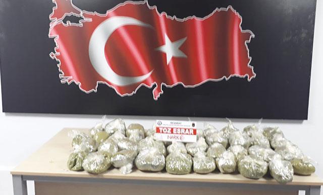 Aksaray-Adana Karayolu kent girişinde rutin kontrol yapan Narkotik Suçlarla Mücadele Şubesi ekipleri, durumundan şüphelendikleri 63 M 5578 plakalı otomobili durdurdu. Otomobilden belindeki tabancayı göstererek inen Veysel Sezer, üzerinde kendi fotoğrafı bulunan Jandarma Kd. Üst. Çvş. Y.V., adına düzenlenmiş askeri kimlik kartını polis ekiplerine verdi. Kendini jandarma istihbarat görevlisi olarak tanıtan Veysel Sezer'in hareketlerinden şüphelenen ekipler, otomobilde arama yaptı. Yapılan aramada otomobilin bagajındaki stepne bölümünde 21 kilo 400 gram esrar ele geçirildi. Veysel Sezer ile birlikte otomobildeki diğer şüpheliler Ahmet Dağ ve Mehmet A.'yı gözaltına alan polis, Veysel Sezer’in kendine askeri personel süsü verdiğini belirledi. Polis, Veysel Sezer ile yanındaki Ahmet Dağ'ın uyuşturucu ve hırsızlık gibi 9 ayrı suçtan arandıklarını tespit etti. Veysel Sezer’in belindeki ruhsatsız tabanca ve iki adet şarjöre de el konuldu. Emniyetteki işlemlerinin ardından adliyeye sevk edilen Veysel Sezer ve Ahmet Dağ, tutuklanırken, Mehmet A. ise adli kontrol şartıyla serbest bırakıldı.