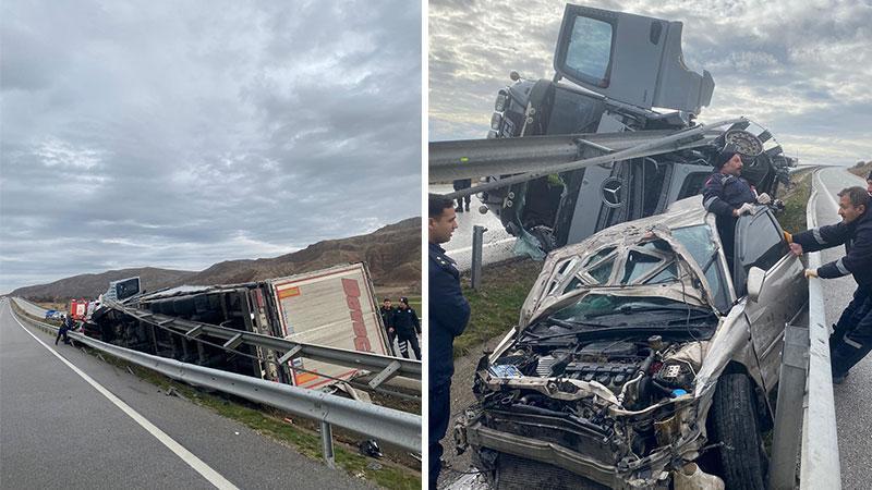 Kaza, öğle saatlerinde Kırıkkale-Çorum kara yolu Hacıobası köyü yakınında meydana geldi. F.K. yönetimindeki 06 BPT 406 plakalı otomobil, şerit değiştirdiği sırada aynı yöne giden B.S. kontrolündeki 07 VS 330 plakalı TIR'la çarpıştı. Çarpışmanın etkisiyle sürüklenen otomobil, yol ortasındaki bariyerlerin arasına sıkışırken, TIR ise devrildi. Kazada, sürücülerle birlikte otomobilde bulunan F.Y. yaralandı. 3 yaralı, olay yerinde sağlık görevlilerince yapılan ilk müdahalenin ardından çevre hastanelere kaldırıldı. Yaralıların hayati tehlikelerinin bulunmadığı öğrenilirken kazayla ilgili inceleme başlatıldı. (DHA)