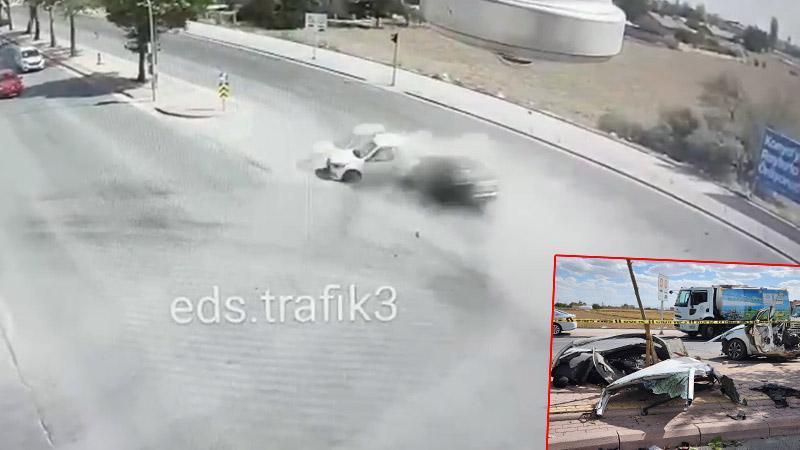 Konya'da otomobilin kırmızı ışıkta duran otomobile çarptığı kazada 1 kişi hayatını kaybetti, 1 kişi yaralandı. Araçlardan birinin ikiye bölündüğü kaza, güvenlik kamerasına yansıdı.