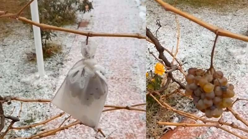 Merkeze bağlı Kervansaray Mahallesi'nde yaşayan Sait Yanık, yaz mevsiminde bahçesindeki asmalarda yetiştirdiği üzümleri toplamadı. Olgunlaşan üzümlerin etrafını poşetle muhafaza altına alan Yanık, yaklaşık 50 salkım üzümü dalında bıraktı. Kış aylarının sert geçtiği bölgede, üzüm salkımlarının büyük kısmı kar ve dondan etkilenmeden korundu. Ancak kargaların zarar vermesi nedeniyle sadece 3 salkım sağlam kaldı. Diğer yandan kar yağışının ardından bölgede hava sıcaklığı eksi 10 dereceye kadar düştü. Sait Yanık, kalan üzümleri kar yağışına rağmen bahçeye inerek dalından topladı. Sait Yanık, o anları cep telefonu kamerasıyla kaydetti. Görüntülerde; Yanık'ın üzümleri, poşetten çıkarıp dalından kopararak topladığı görüldü.