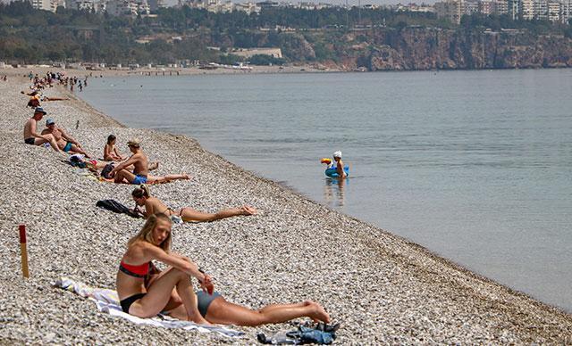 Antalya'da güneşli ve sıcak havayı fırsat bilen kısıtlamadan muaf turistler, sahile gitti. Kısıtlamayı ihlal eden bazı kişiler de denize girdi.