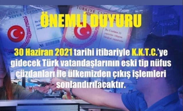Göçmen Kaçakçılığıyla Mücadele ve Hudut Kapıları Daire Başkanlığı, 'KKTC'ye gidecek Türk vatandaşlarının dikkatine' uyarısıyla bir açıklama yaptı. Açıklamada, "30 Haziran 2021 tarihi itibariyle KKTC'ye gidecek Türk vatandaşlarının eski tip nüfus cüzdanları ile ülkemizden çıkış işlemleri sonlandırılacaktır. Yeni tip kimlik kartı ile çıkılması zorunludur." denildi.