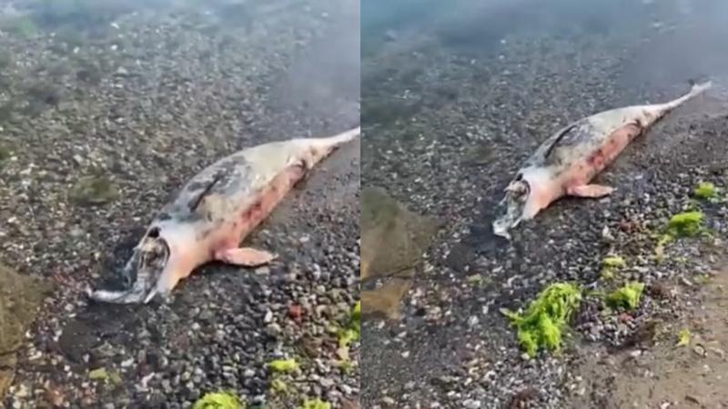 Kocaeli’nin Başiskele ilçesi sahilinde, kafası parçalanmış ölü yunus balığı kıyıya vurdu.