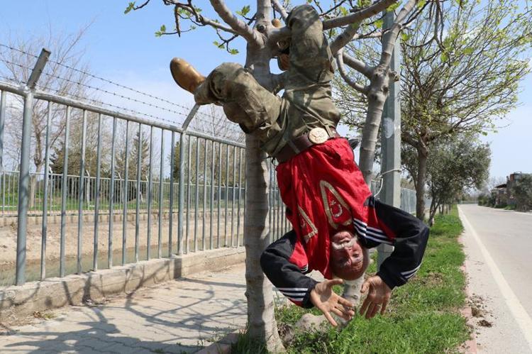Öte yandan İbrahim Cebeci, kamuflaj kıyafetler giyip, ağaç dallarından baş aşağı sarkarak, söylediği komando marşıyla sosyal medyada 'komando dede' olarak tanınıyor.