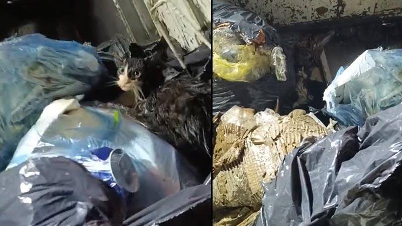 Konteyneri boşaltırken gördükleri ağzı bağlanmış poşetteki kediyi kurtardılar