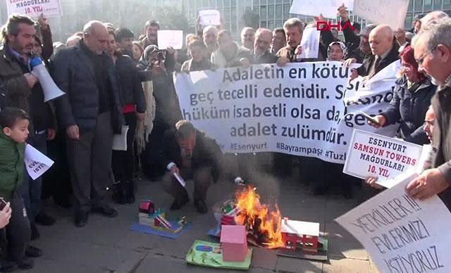 Çeşitli inşaat firmalarının evlerini süresinde teslim etmediğini belirten bir grup, maket evler yakarak eylem yaptı.