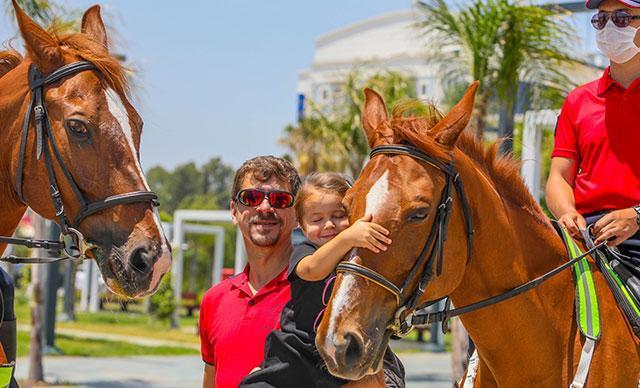 Kimi zaman siyah, kimi zaman beyaz ve kırmızı üniforma giyen atlı polislere, çocuklar da sevgisi gösterisinde bulunuyor.