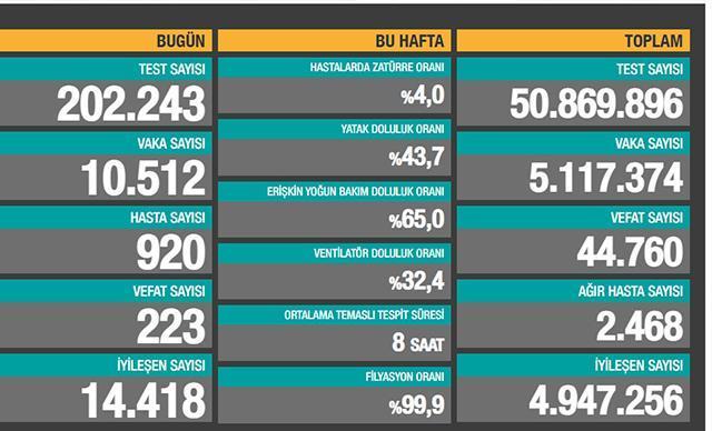 Sağlık Bakanlığı'nca duyurulan 'Türkiye Covid- 19 Hasta Tablosu'na göre; son 24 saatte yapılan 202 bin 243 testte 10 bin 512 vaka, 920 hasta tespit edildi. Virüs nedeniyle 223 kişi hayatını kaybederken, 14 bin 418 kişinin de tedavisi ve karantinası sona erdi. Bugünkü verilerle toplam test sayısı 50 milyon 869 bin 896, toplam vaka sayısı 5 milyon 117 bin 374, toplam vefat sayısı 44 bin 760, toplam ağır hasta sayısı 2 bin 468, toplam iyileşen sayısı ise 4 milyon 947 bin 256 oldu.
