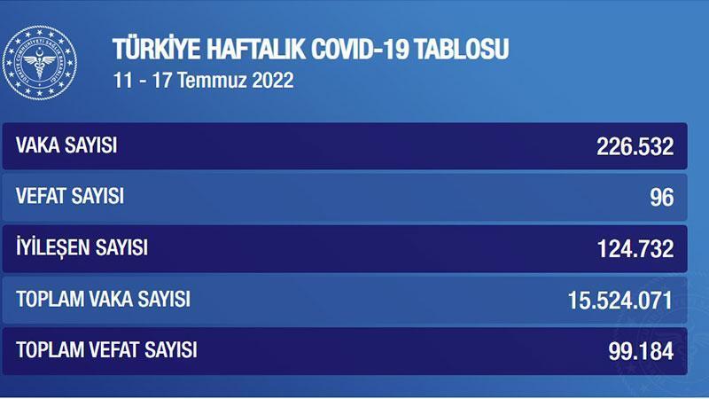 Sağlık Bakanlığınca açıklanan haftalık Covid-19 tablosuna göre, 11-17 Temmuz arasında vaka sayısı 226 bin 532 oldu, 96 kişi hayatını kaybederken, 124 bin 732 kişinin de karantina ve tedavisi sona erdi.