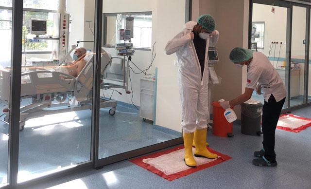 Hastanenin yoğun bakım ünitesinde 81 yatak bulunuyor. 2 bölümden oluşan yoğun bakımın 48 yataklı birinci bölümünde yatan hastaların tamamı, koronavirüs tedavisi görüyor. Alışılagelmiş yoğun bakım ünitelerinden farklı olarak hastalar, ayrı ayrı ve cam kapıları olan odalarda yatıyor. Doktorlar, tedavi uygulayacakları her bir hastanın odasına girmeden önce, kapı önünde koruyucu ekipmanlarını büyük bir titizlikle giyiniyor. Vücutlarında açıkta kalan herhangi bir nokta kalmadığından emin olan sağlık çalışanları, her bir hasta ile özenle ilgileniyor. Tedavilerini tamamladıktan sonra odadan çıktıklarında ise hiçbir yere dokunmadan, arkadaşlarının yardımıyla dezenfekte olarak, koruyucu ekipmanlarını çıkarıyorlar.