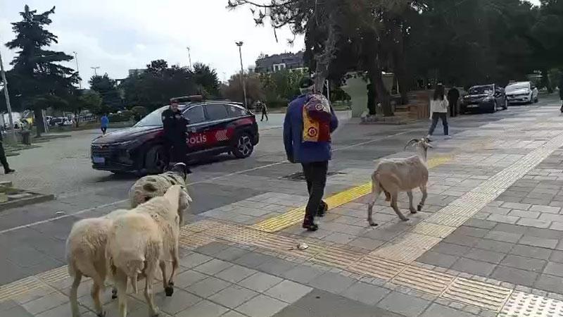 Küçükçekmece’de bir kişi, 4 koyunu ile yürürken görüntülendi