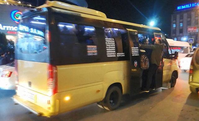 Küçükçekmece'de minibüs şoförleri, minibüslerinin dolmasına rağmen kapıyı kapatmayarak merdivende yolcu götürüyor.