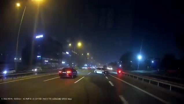 Küçükçekmece'de otoyolda savrulan otomobil bariyerlere çarptı; kaza kamerada