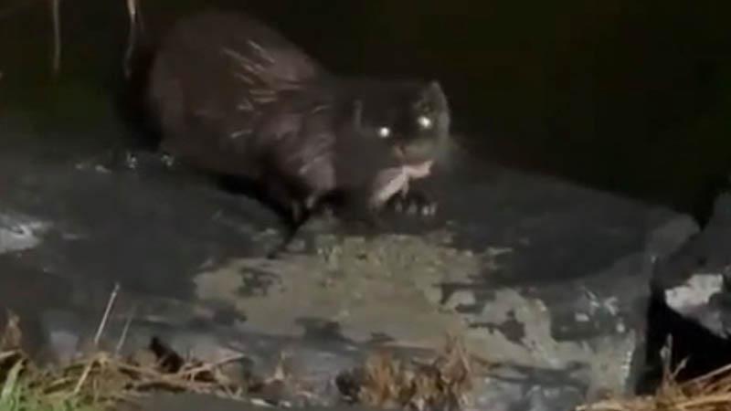 Küçükçekmece'de nesli tükenme tehlikesi altında bulunan su samuru, göl kenarında balık yerken cep telefonu kamerasıyla görüntülendi.