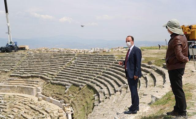 Denizli'de, UNESCO Dünya Kültür Mirası Geçici Listesi'ndeki, Laodikya Antik Kenti'nde bulunan 2 bin 200 yıllık antik tiyatroda kazı ve restorasyon çalışmaları sürüyor. Antik kenti ziyaret eden ve çalışanlara maske dağıtan AK Partili Pamukkale Belediye Başkanı Avni Örki, antik tiyatroda önümüzdeki mart ayından itibaren çeşitli etkinlikler yapılabileceğini söyledi.