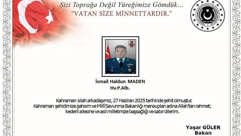 Bakanlıktan yapılan açıklamada, "Libya'da görev yapmakta olan Hava Piyade Albay İsmail Haldun Maden, geçirdiği kalp krizi neticesinde derhal hastaneye sevk edilmiş, yapılan tüm müdahalelere rağmen kurtarılamayarak 27 Haziran 2025 tarihinde şehit olmuştur. Bizleri derin bir acı ve üzüntüye boğan bu olayda, hayatını kaybeden aziz şehidimize Allah'tan rahmet, kederli ailesine, Türk Silahlı Kuvvetleri ile asil milletimize başsağlığı ve sabır dileriz" denildi.
