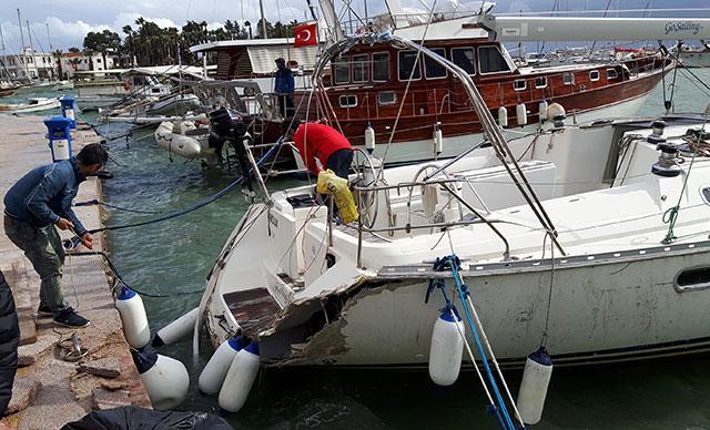 Muğla'nın Datça ilçesinde, limana demirli olan, ABD bayraklı, 14 metre uzunluğundaki 'Anouk' adlı fiber teknenin kıç tarafı, fırtınada beton rıhtıma çarparak, hasar gördü.