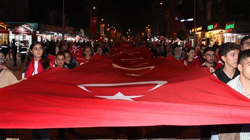 70 metre uzunluğundaki Türk Bayrağı'nı taşıyan kortejde, askeri bando eşliğinde kahramanlık marşları söylendi.