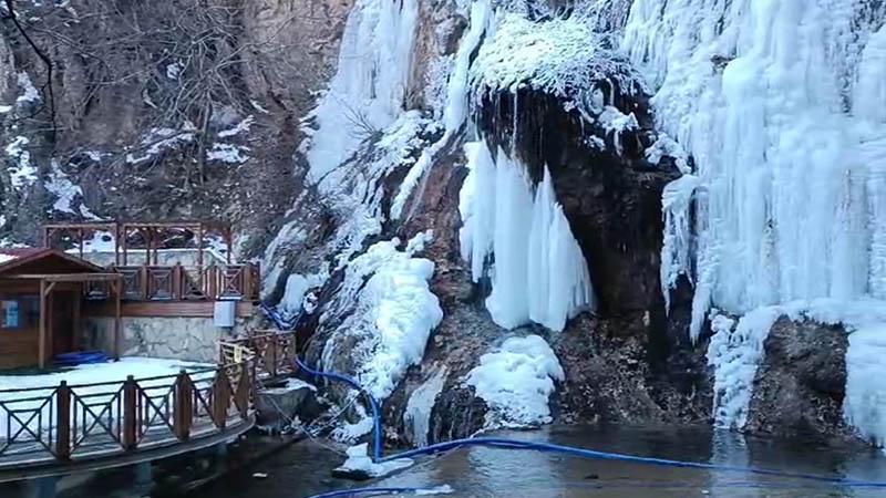 40 metre yükseklikten akan suyun donması ile dev buz sarkıtları oluştu. Şelalenin donmuş görüntüsü ziyaretçilerin ilgisini çekti.