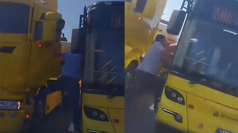 Maltepe D-100 Karayolu’nda İETT otobüsü şoförüyle TIR şoförü arasında yol verme nedeniyle tartışma çıktı. Tartışmanın ksıa sürede büyümesi üzerine TIR’da bulunan diğer kişi araçtan inip, otobüse bindi ardından da şoföre yumrukla saldırıp küfür etti. O anlar cep telefonu kamerasına yansıdı.